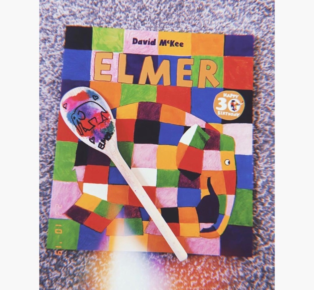 Then I had one spoon left over and another favourite bedtime book of ours is Elmer. I sponged on different colours paints to match the theme of our colourful bedtime mate. Let it dry and then used a sharpie to freehand draw a similar (not the best lol) elephant.